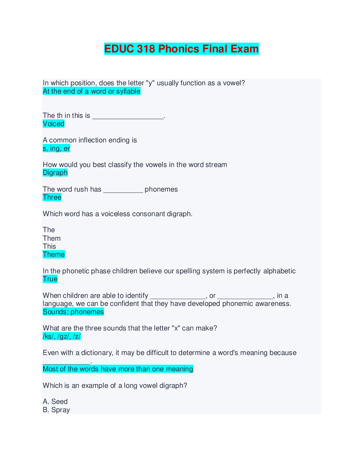 Linguistics > EXAM > EDUC 318 Phonics Final Exam | Questions and Answers (All)