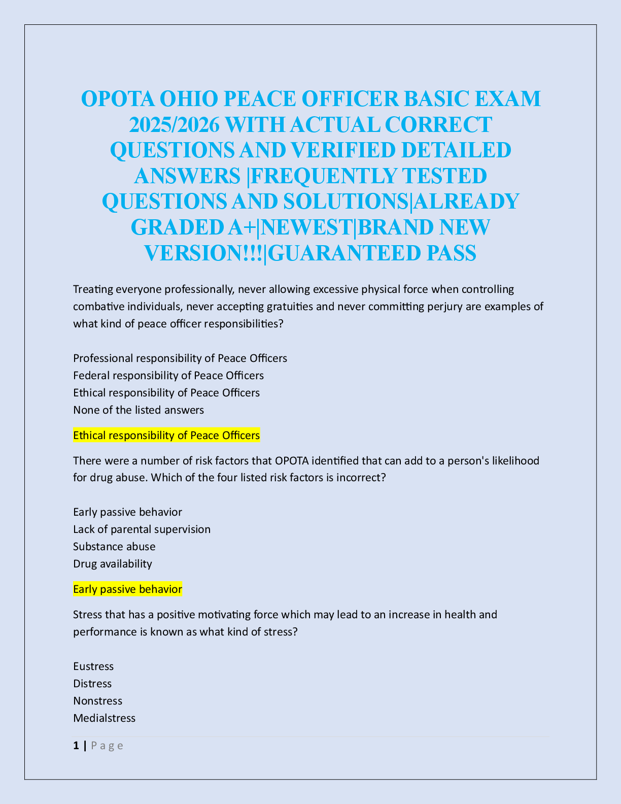 Criminal Justice > EXAMs > OPOTA OHIO PEACE OFFICER BASIC EXAM (All)
