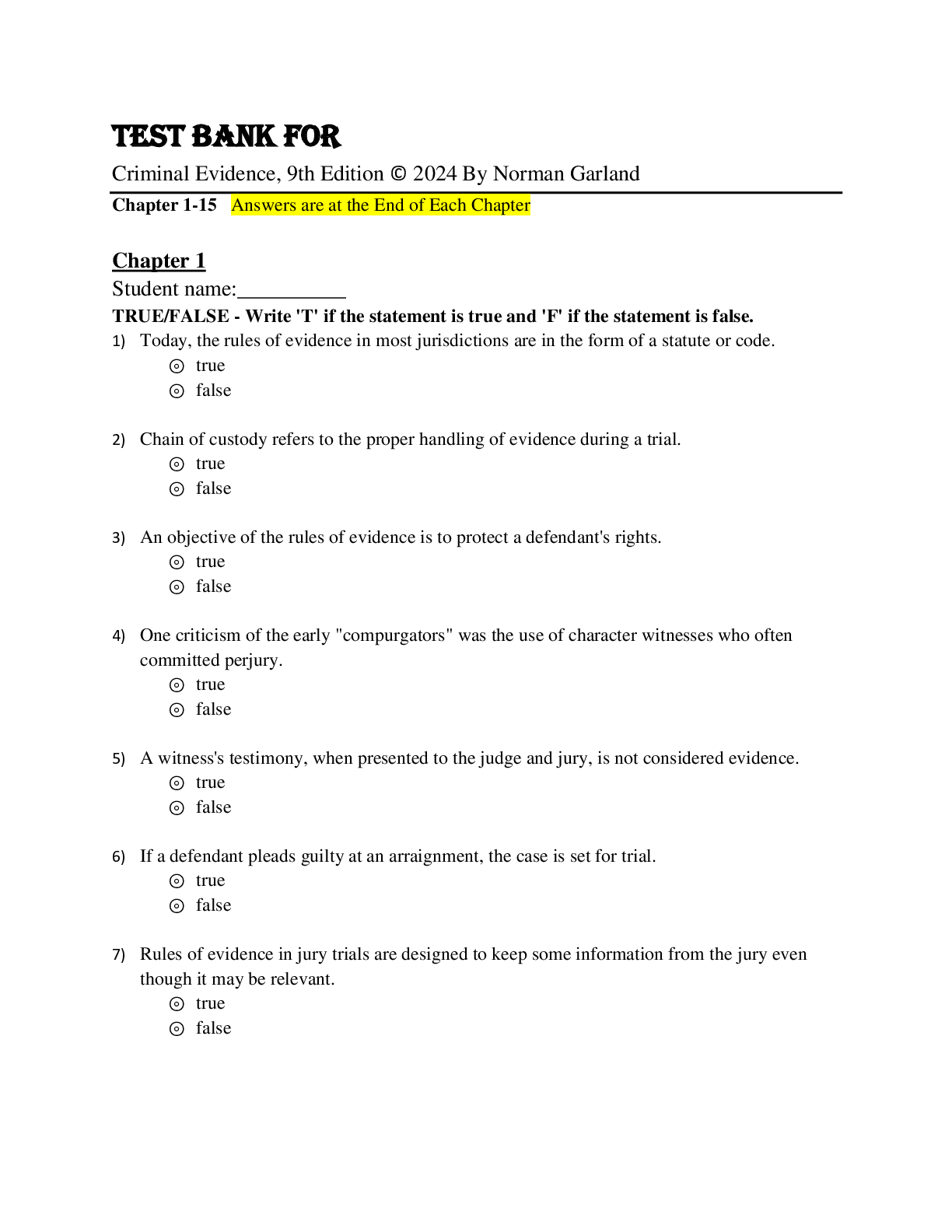 Criminal Justice > TEST BANKS > Test Bank For Criminal Evidence, 9th Edition © 2024 By Norman Garland Chapter 1-15 (All)