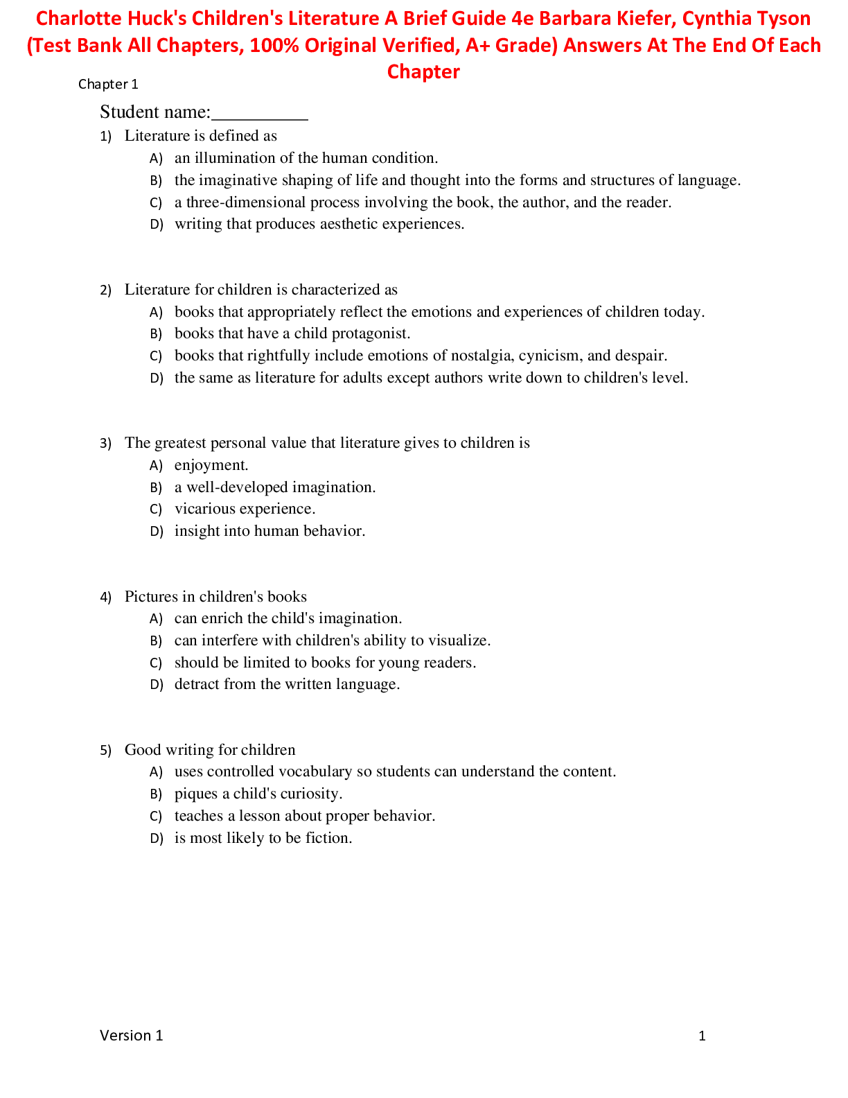 Literary Studies > TEST BANKS > Test Bank For Charlotte Huck's Children's Literature A Brief Guide 4th Edition By Barbara Kiefer, Cynthia Tyson (All Chapters, 100% Original Verified, A+ Grade) (All)