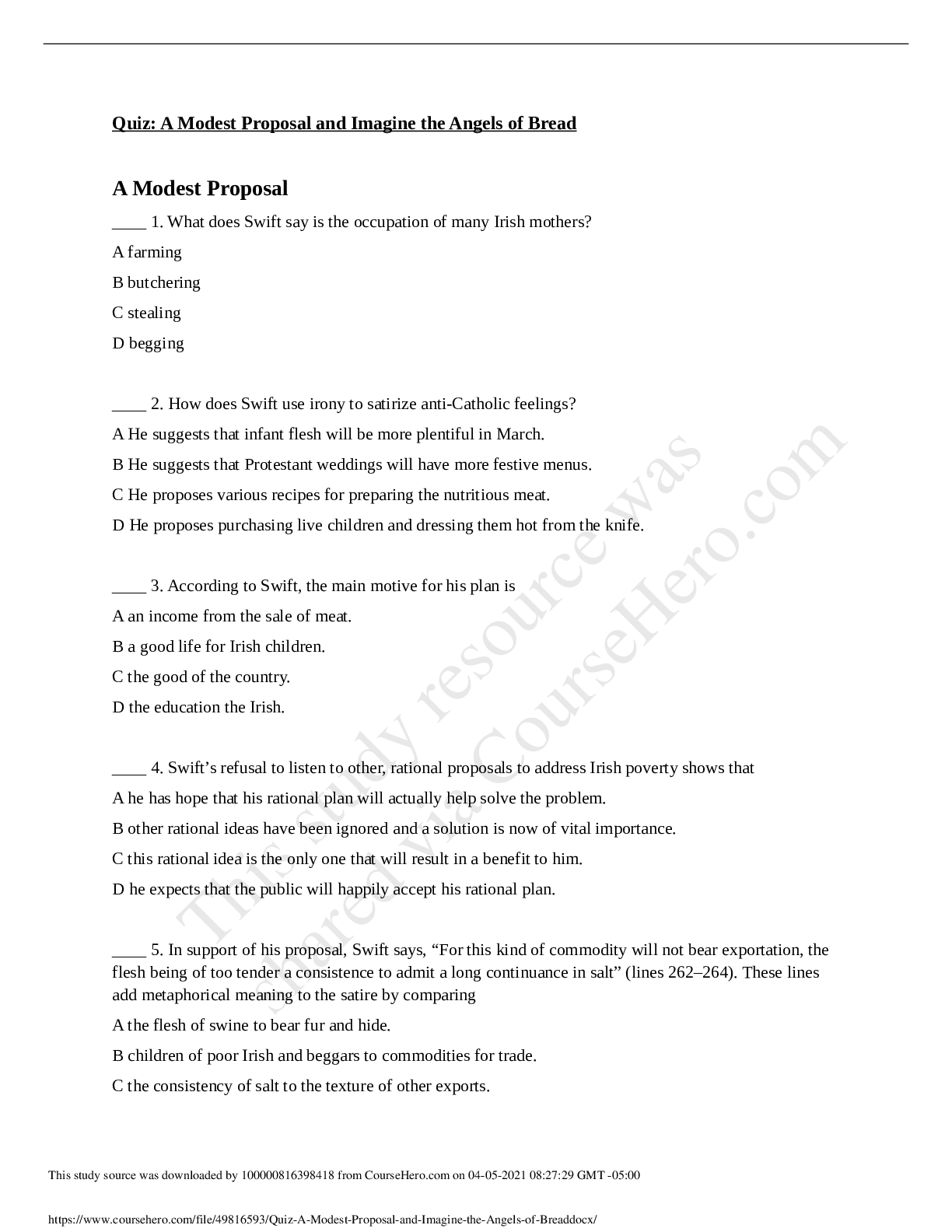 Literary Studies > STUDY GUIDE > Redan High School - LIT 101Quiz_ A Modest Proposal and Imagine the Angels of Bread. (All)