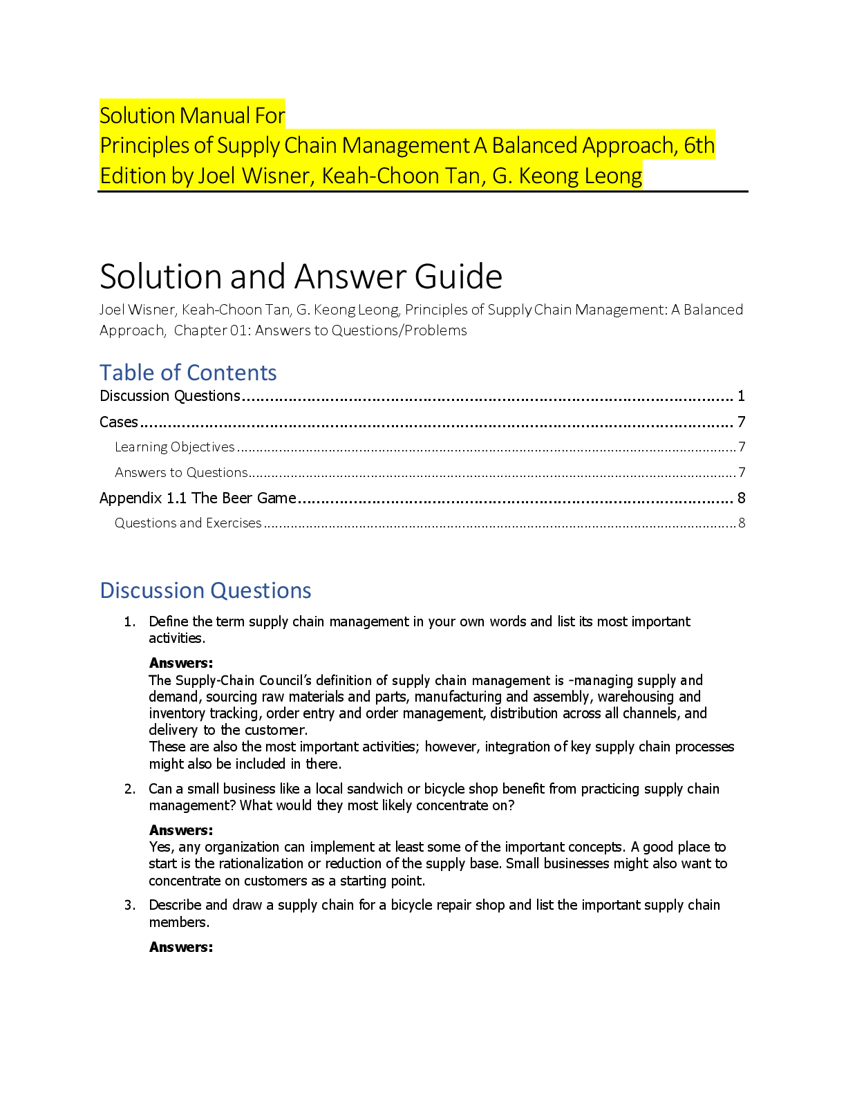 Supply Chain Management > SOLUTIONS MANUAL > Solution Manual For Principles of Supply Chain Management A Balanced Approach, 6th Edition by Joel Wisner, Keah-Choon Tan A+ (All)