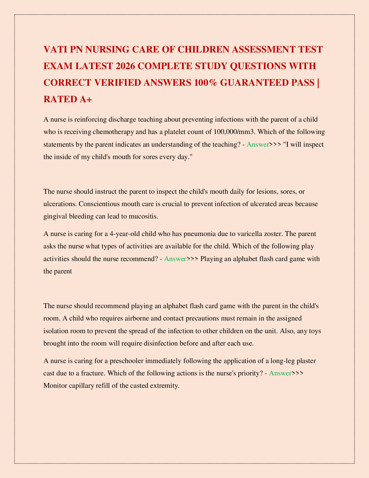 VATI RN Maternal Newborn Assessment > EXAMs > VATI PN NURSING CARE OF CHILDREN ASSESSMENT TEST EXAM LATEST 2026 COMPLETE STUDY QUESTIONS WITH CORRECT VERIFIED ANSWERS 100% GUARANTEED PASS | RATED A+ (All)