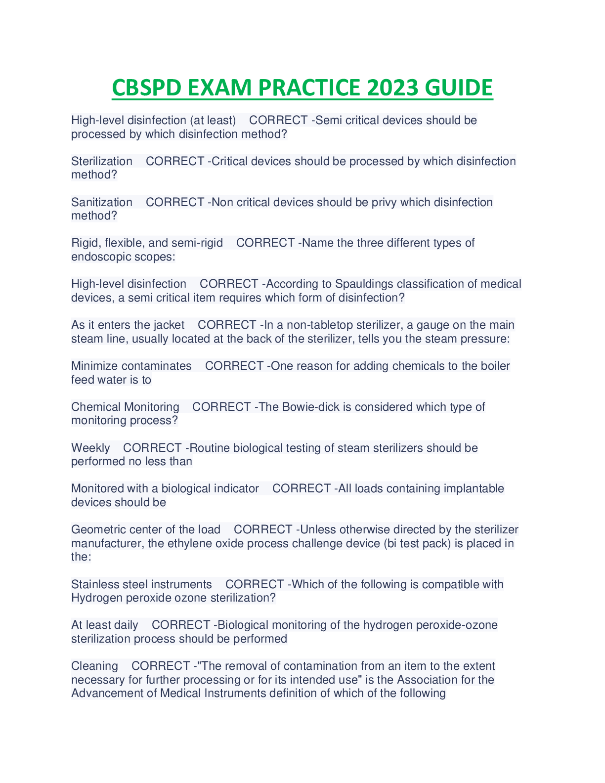 CBSPD > EXAM > CBSPD STERILE PROCESSING EXAM TEST 2023 GUIDE 100% VERIFIED. (All)