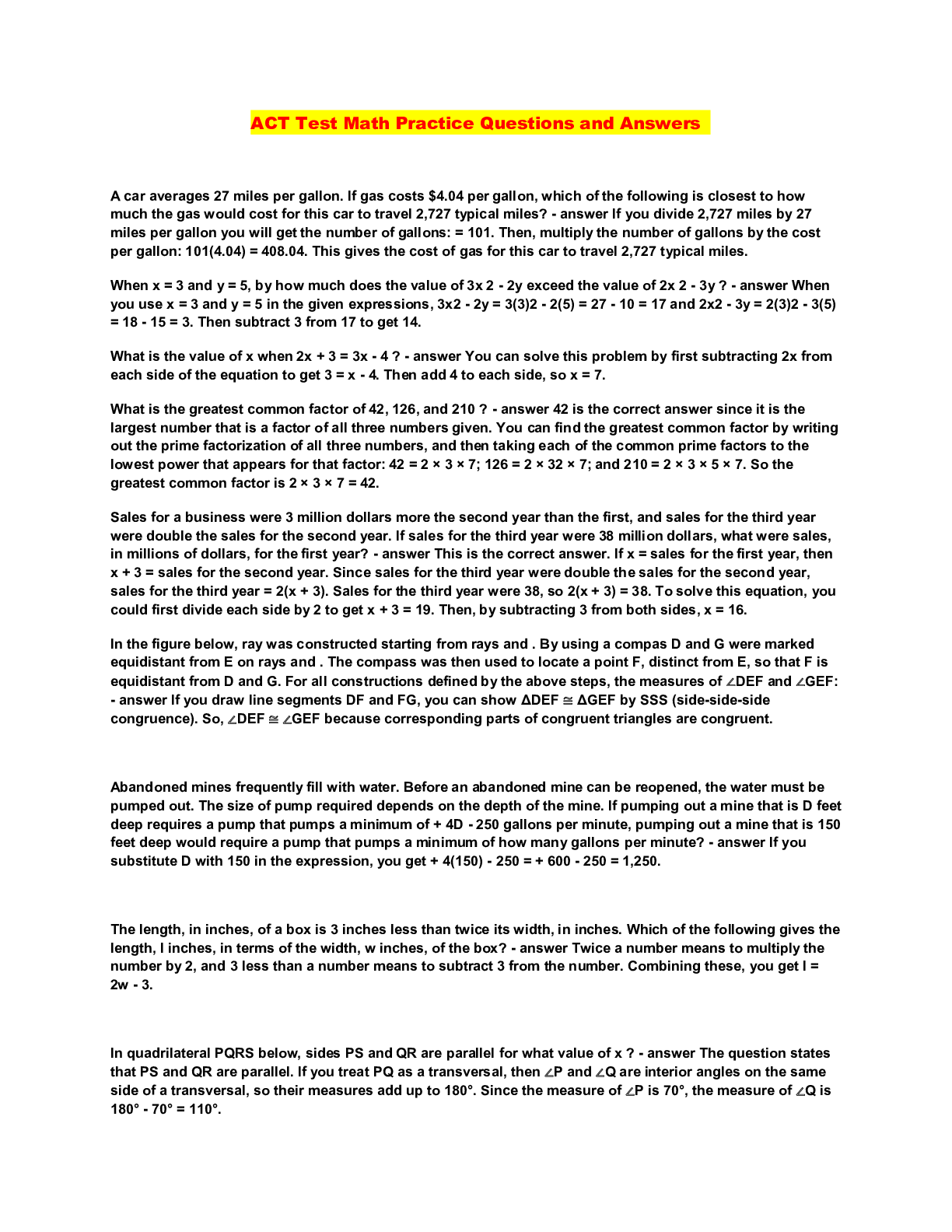 Mathematics > QUESTIONS & ANSWERS > ACT Test Math Practice Questions and Answers (All)