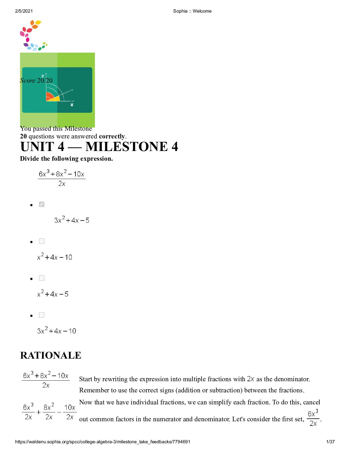 Mathematics > SOPHIA Milestone > SOPHIA LEARNING COLLEGE ALGEBRA QUESTION WITH RATIONALE AND ANSWERS (All)