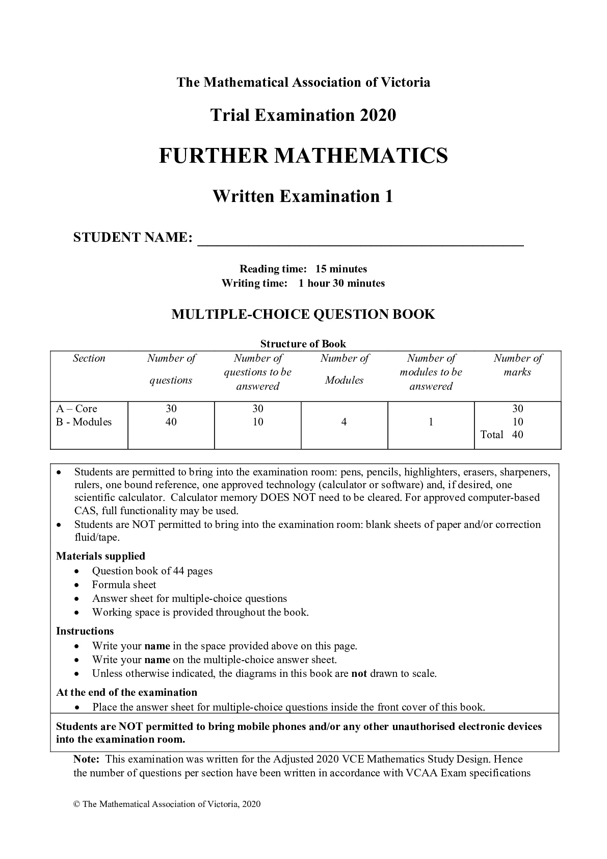 Mathematics > SOLUTIONS MANUAL > Questions Paper > BUSINESS BSBWHS601 The Mathematical Association of Victoria Trial Examination 2020 FURTHER MATHEMATICS Written Examination 1 (All)