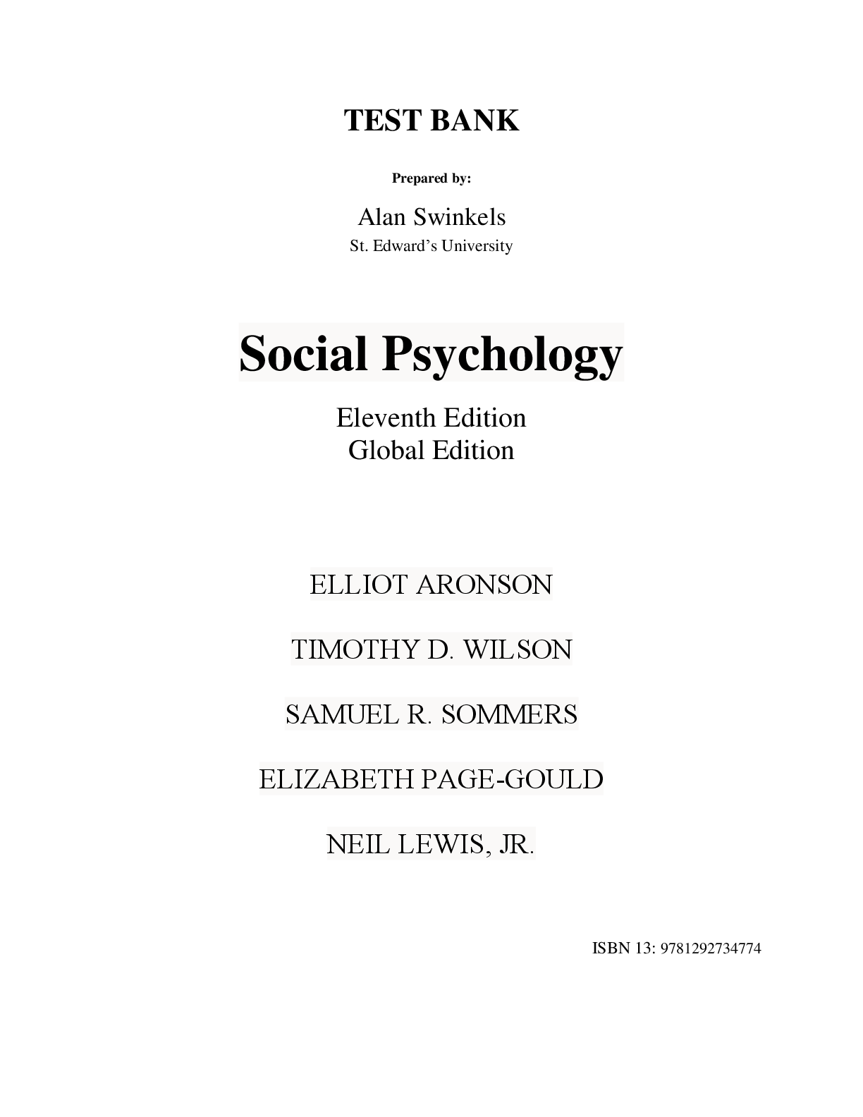 Social Psychology > TEST BANKS > Test Bank For Social Psychology, Global Edition, 11th Edition By Elliot Aronson Timothy D. Wilson Samuel R Sommers Elizabeth Page-Gould Neil Lewis Jr (All)