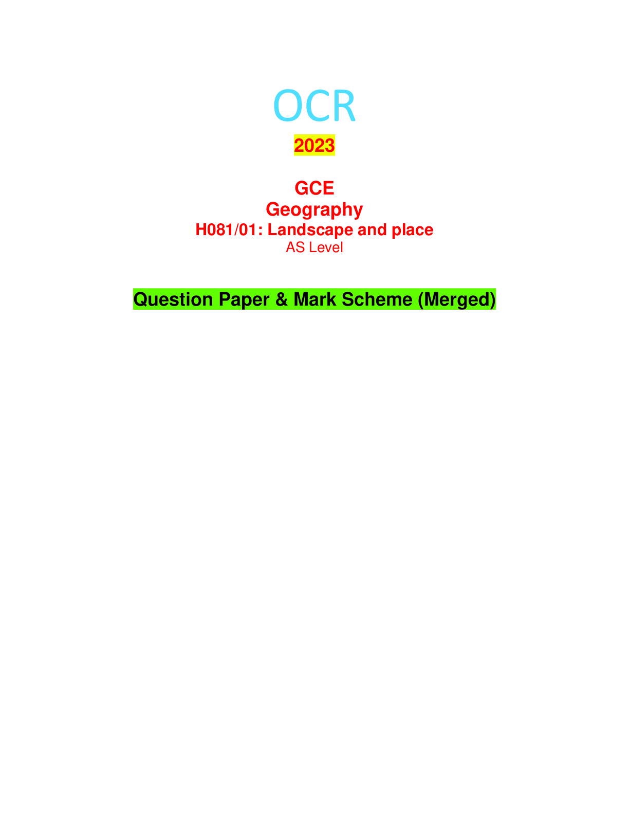 OCR > EXAM > 2023 GCE Geography H081/01: Landscape and place AS Level Question Paper & Mark Scheme (Merged) (All)