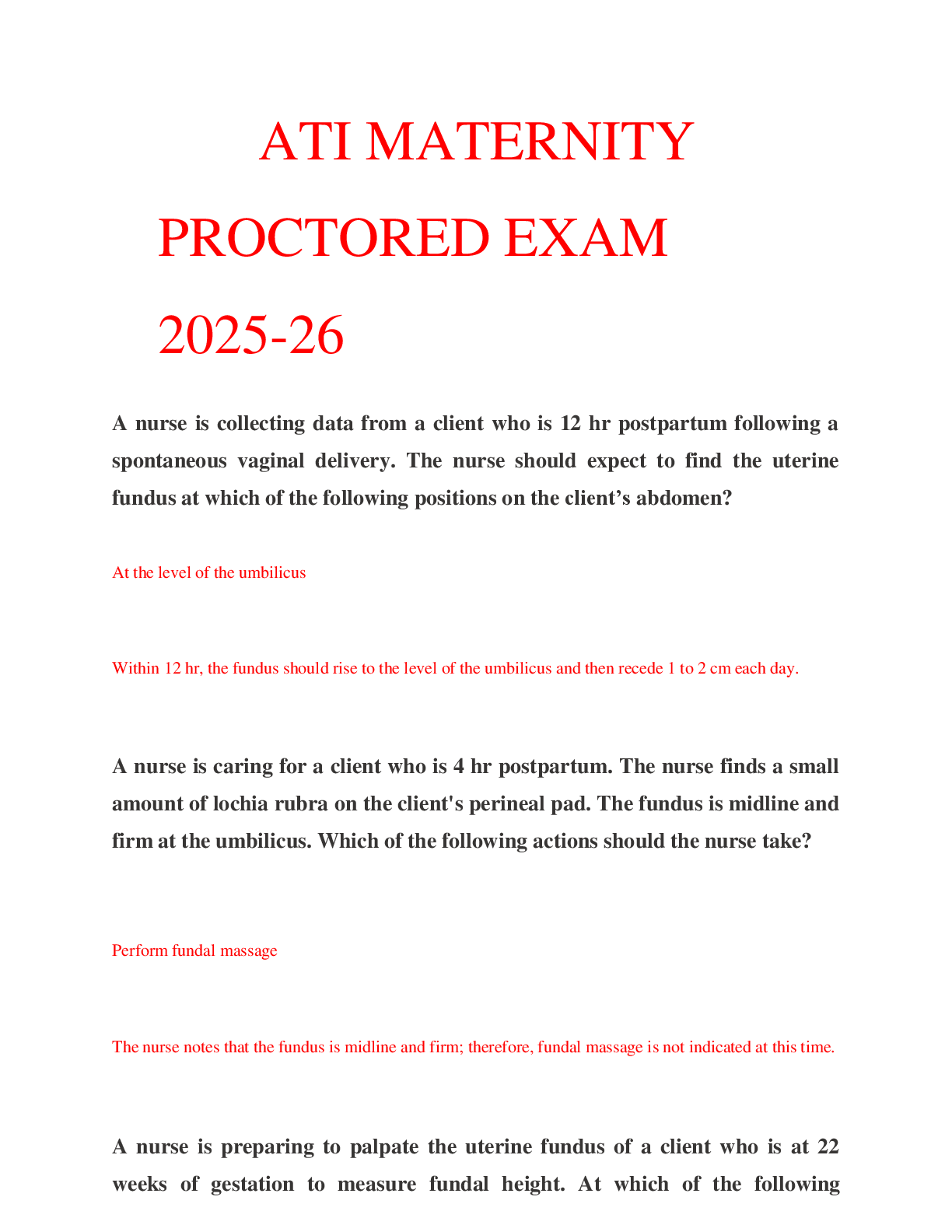 ATI Proctored Exam Maternal Newborn > QUESTIONS & ANSWERS > ATI MATERNAL NEWBORN PROCTORED EXAM 2025-26 (All)