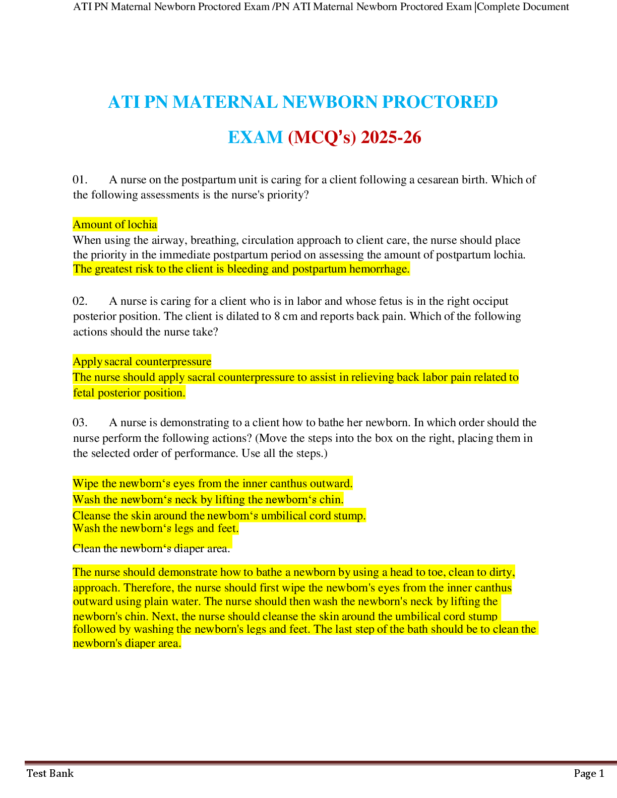 ATI RN MATERNAL NEWBORN PROCTORED > QUESTIONS & ANSWERS > ATI PN MATERNAL NEWBORN PROCTORED EXAM (MCQ’s) 2025-26 (All)
