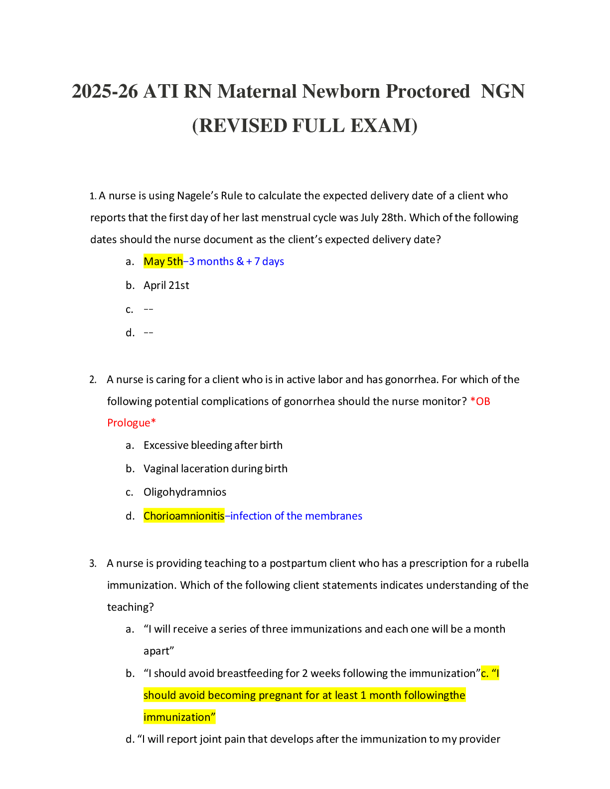 ATI RN MATERNAL NEWBORN PROCTORED > QUESTIONS & ANSWERS > 2025-26 ATI RN Maternal Newborn Proctored NGN (REVISED FULL EXAM (All)