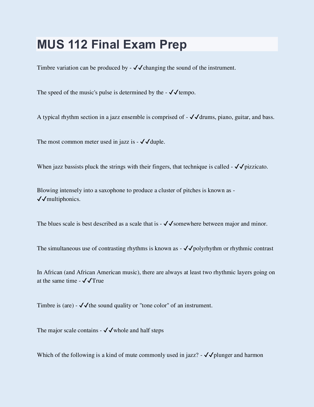 Music > EXAM > MUS 112 Final Exam Prep | 270 Questions with 100% Correct Answers | Updated & Verified | 24 Pages (All)