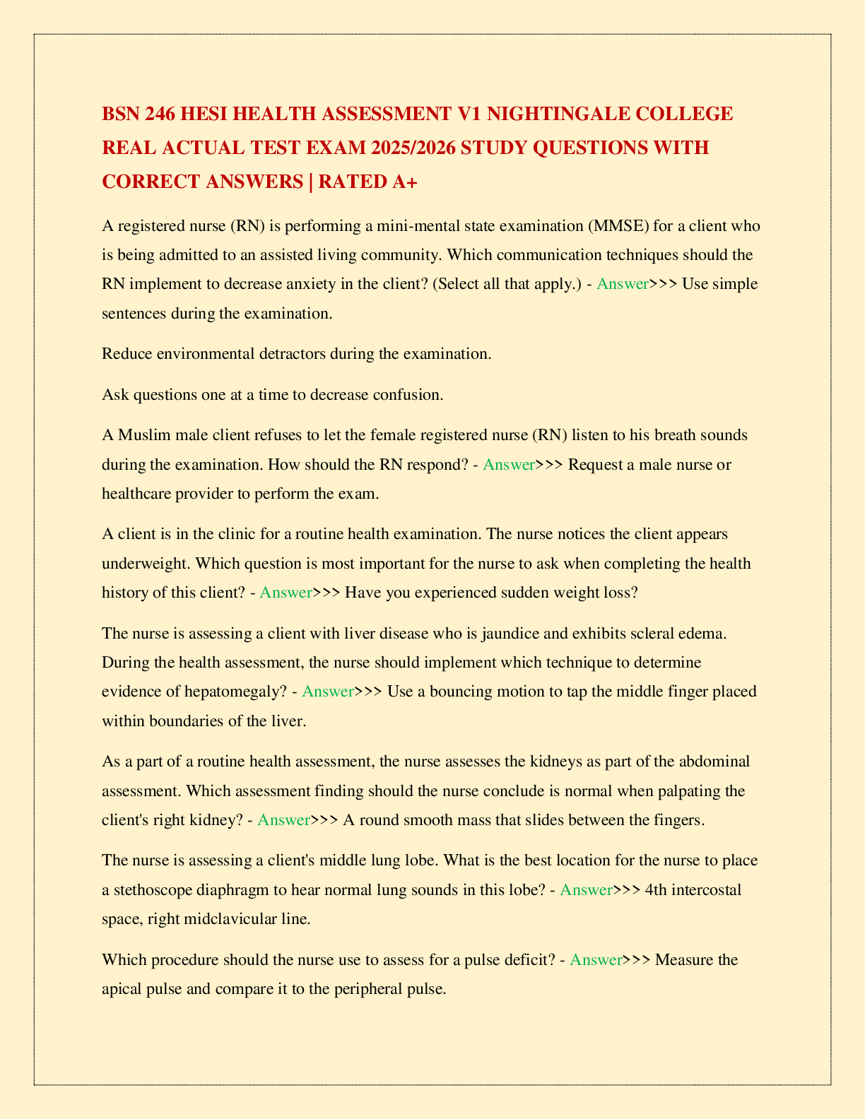 HESI > EXAM > BSN 246 HESI HEALTH ASSESSMENT V1 NIGHTINGALE COLLEGE REAL ACTUAL TEST EXAM 2025/2026 STUDY QUESTIONS WITH CORRECT ANSWERS | RATED A+ (All)