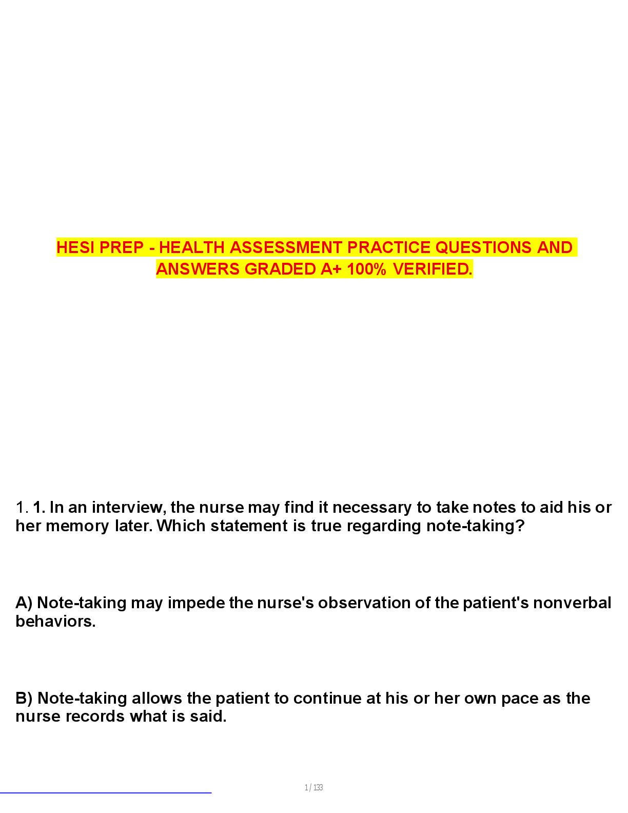 HESI > EXAM > HESI Prep: Health Assessment Practice Questions and Answers – Graded A+ | 100% Verified (All)