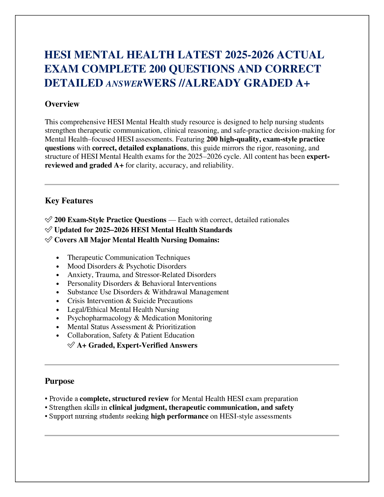 HESI > EXAM > HESI MENTAL HEALTH LATEST 2025-2026 ACTUAL EXAM COMPLETE 200 QUESTIONS AND CORRECT DETAILED ANSWERWERS //ALREADY GRADED A+ (All)
