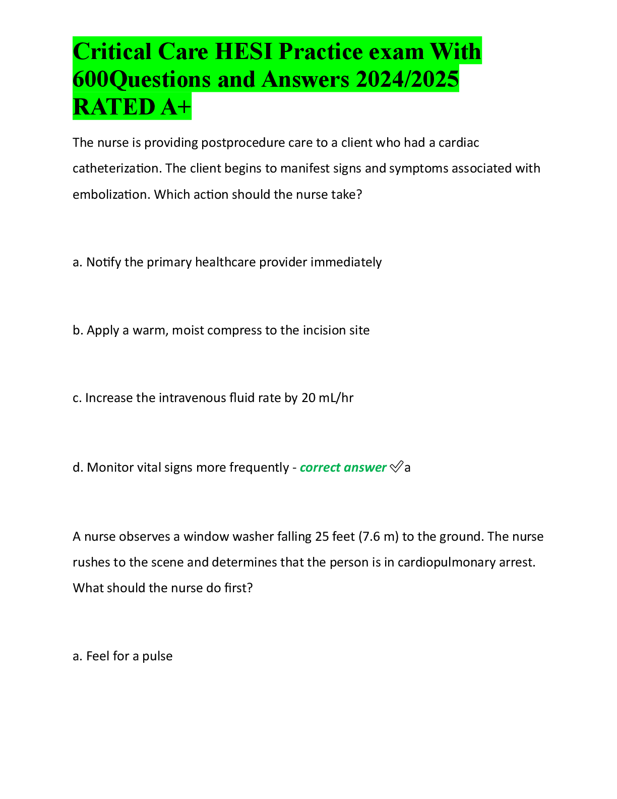 HESI > EXAM > Critical Care HESI Practice exam With 600Questions and Answers 2024 2025 RATED A (All)