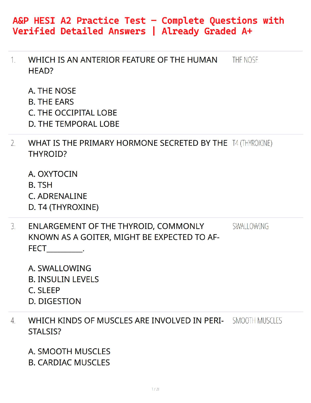 HESI > STUDY GUIDE > A&P HESI A2 Practice Test – Complete Questions with Verified Detailed Answers | Already Graded A+ (All)
