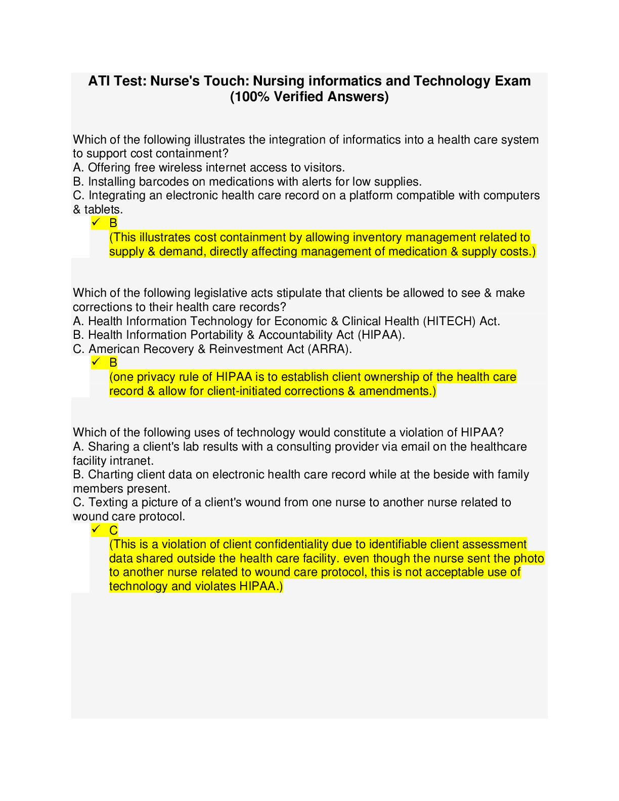 nursing informatics and technology > EXAM > ATI Test Nurse's Touch Nursing informatics and Technology Exam (100% Verified Answers) (All)