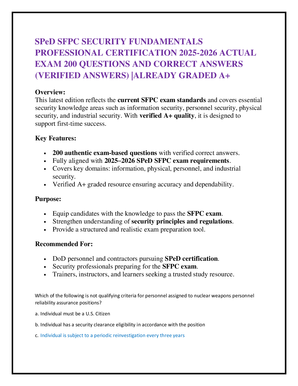 SECURITY > EXAM > SPeD SFPC SECURITY FUNDAMENTALS PROFESSIONAL CERTIFICATION 2025-2026 ACTUAL EXAM 200 QUESTIONS AND CORRECT ANSWERS (VERIFIED ANSWERS) |ALREADY GRADED A+ (All)