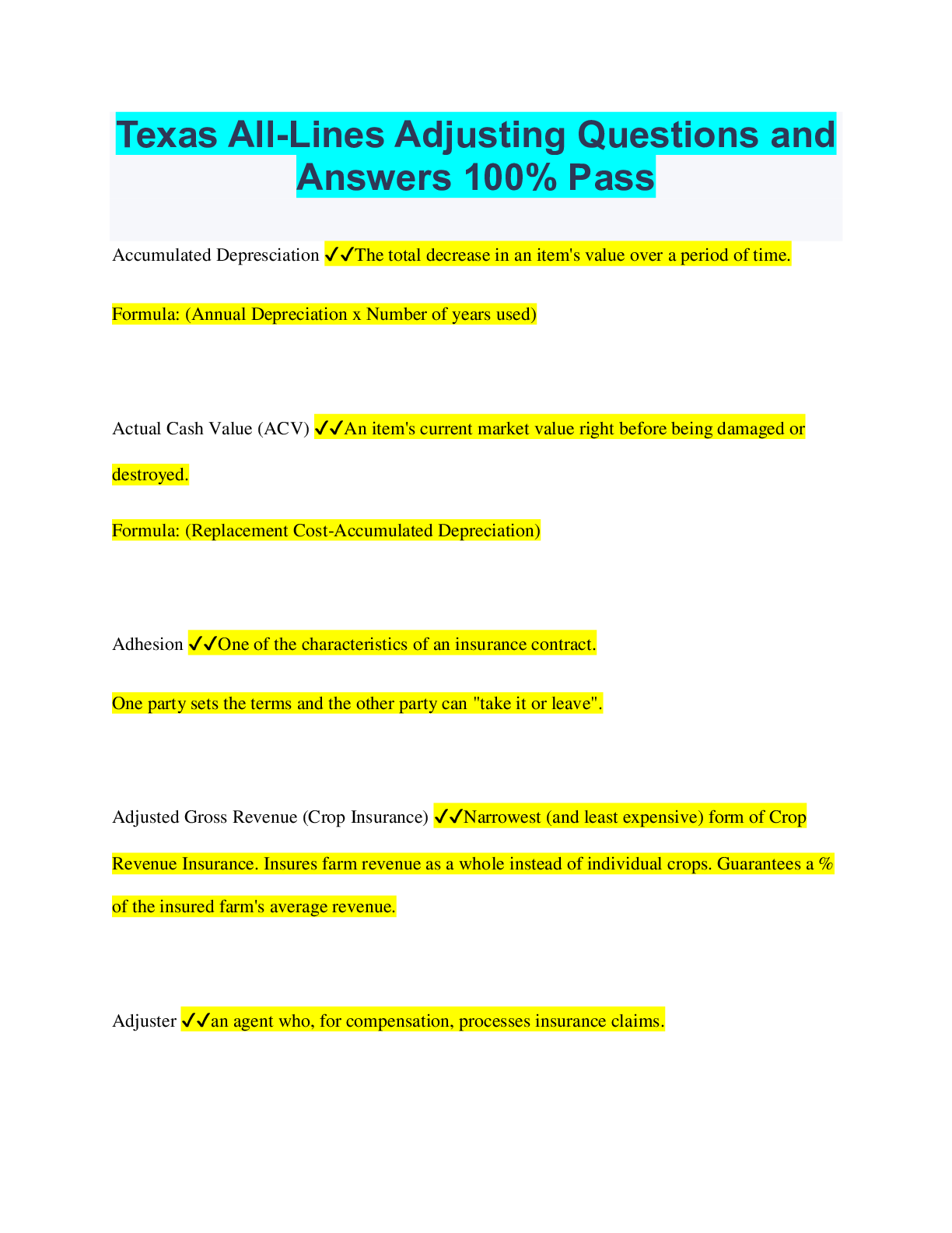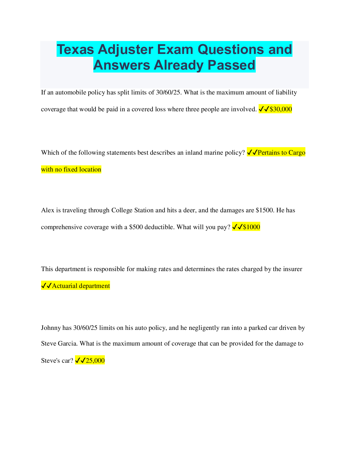 Claims Adjuster > QUESTIONS & ANSWERS > Texas Adjuster Exam Questions and Answers Already Passed (All)