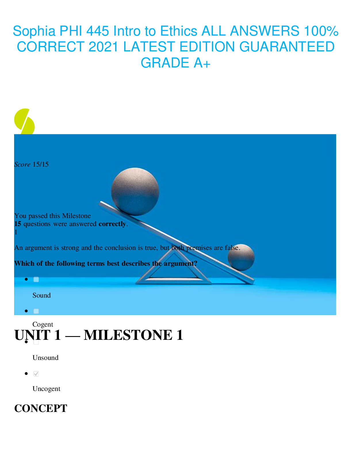 Philosophy > SOPHIA Milestone > (answered) Sophia PHI 445 Intro to Ethics UNIT 1 — MILESTONE 1_ 15/15; Fall 2021 (All)