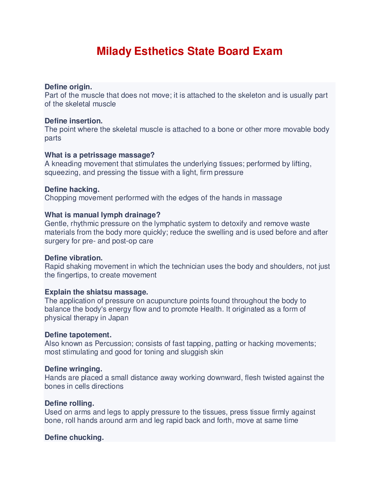 Philosophy > EXAM > Milady Esthetics State Board Exam - Questions and Answers (All)