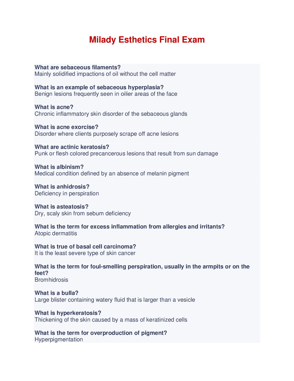 Philosophy > EXAM > Milady Esthetics Final Exam - Questions and Answers (All)