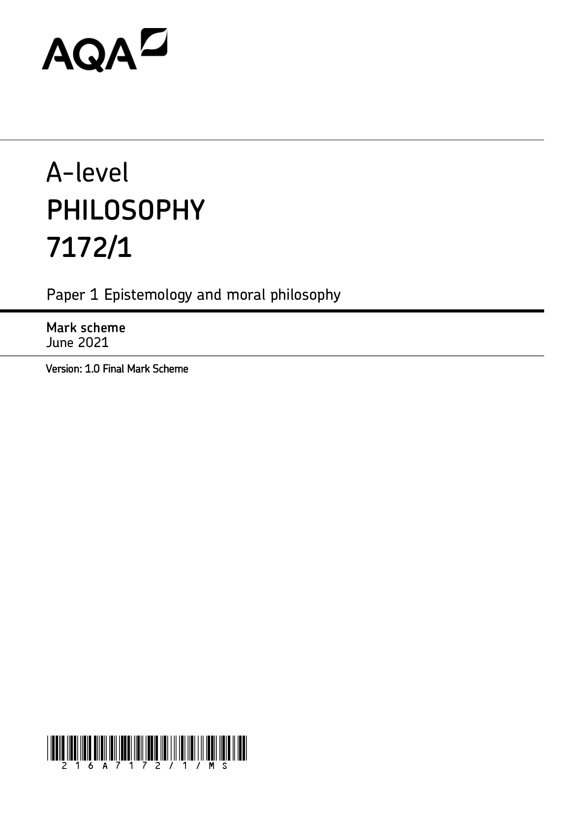 Philosophy > AQA QUESTION and MARK SCHEMES > AQA A-level PHILOSOPHY 7172/2 Paper 2 The metaphysics of God and the metaphysics of mind Mark scheme June 2021 Version: 1.0 Final Mark Scheme (All)
