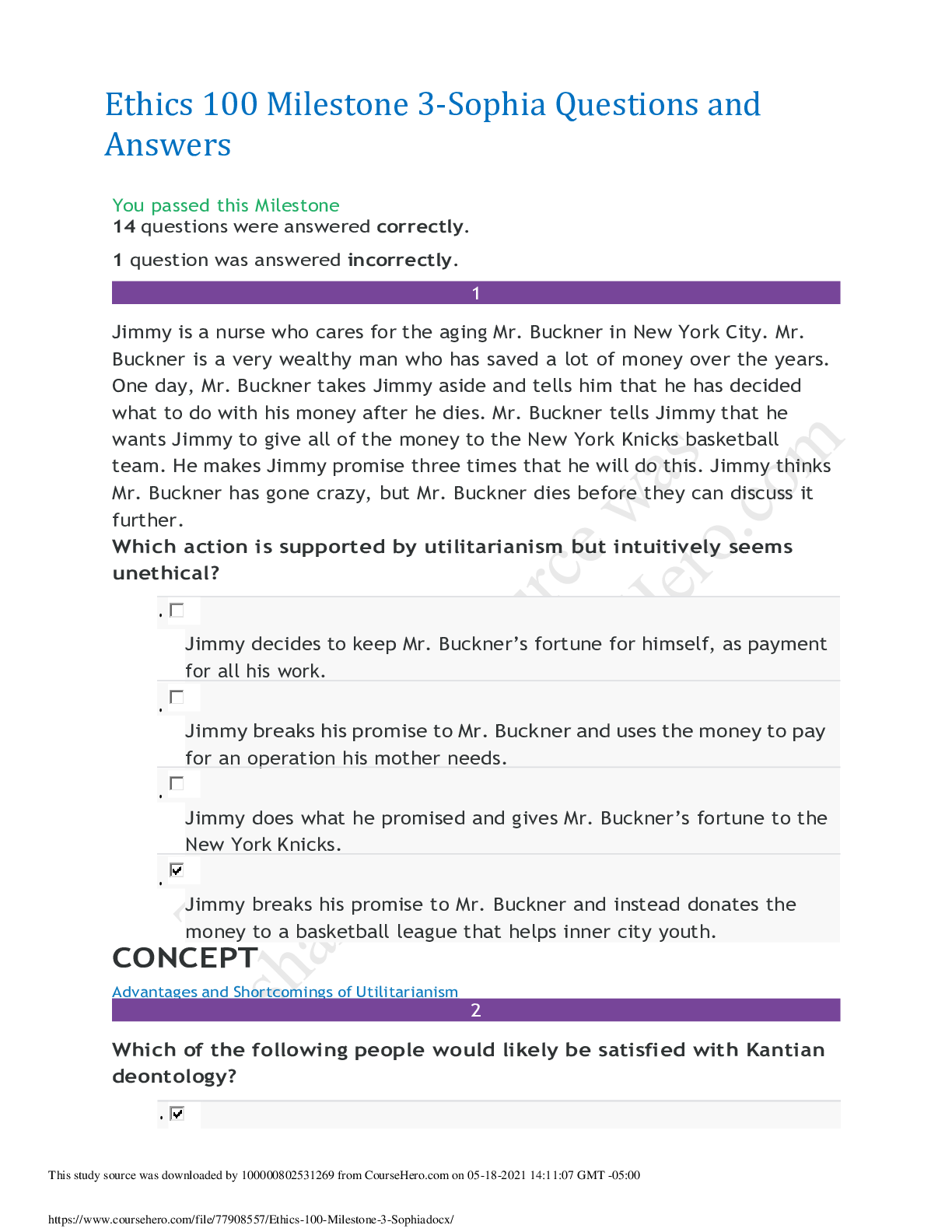 Philosophy > EXAM > Ethics 100 Milestone 3-Sophia Questions and Answers,100% CORRECT (All)