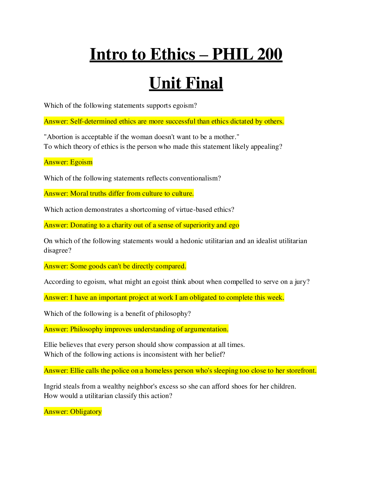 Philosophy > EXAM > PHL 200 Introduction to Ethics Unit 4 - Questions and Answers (All)