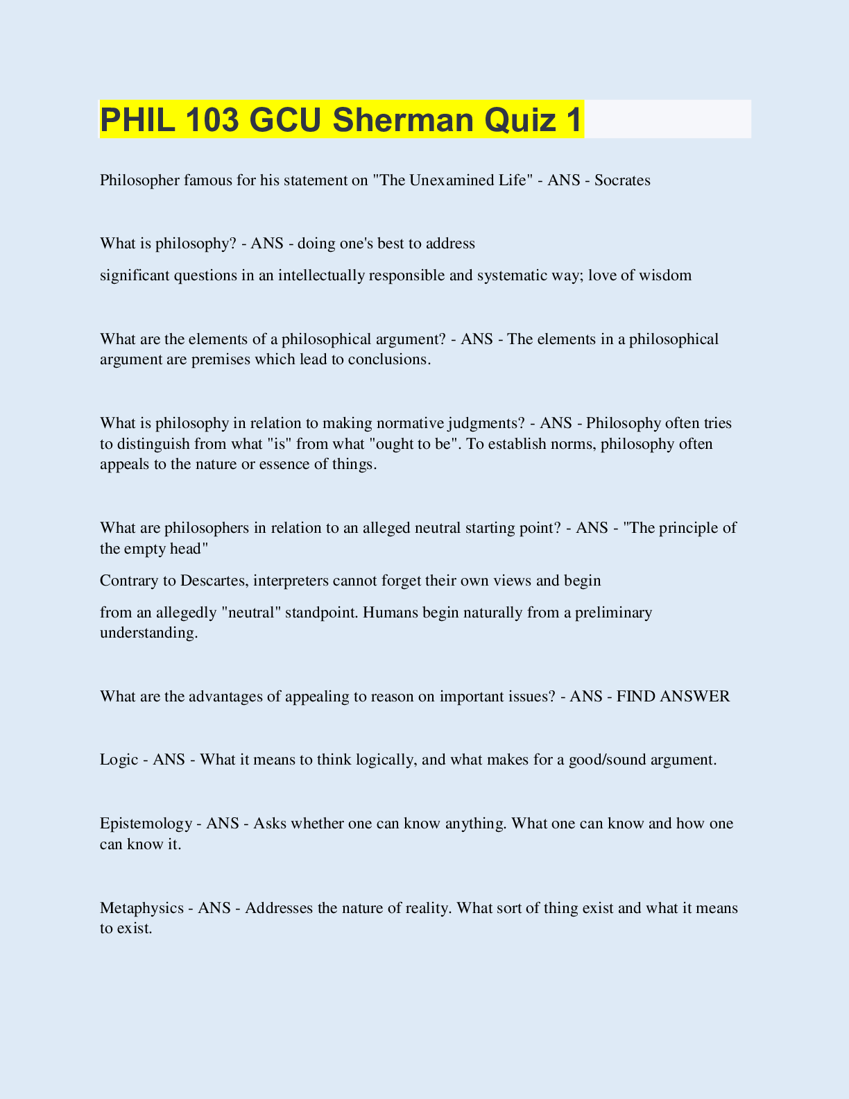 Philosophy > EXAM > PHIL 103 GCU Sherman Quiz 1 | 50 Questions with 100% Correct Answers | Updated & Verified (All)