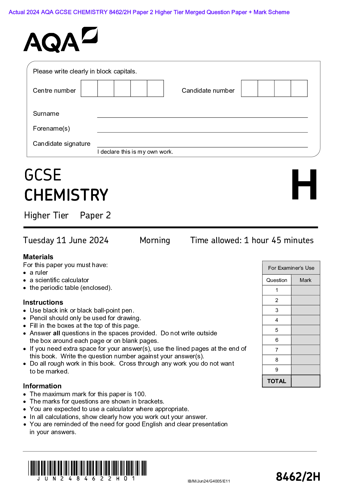 AQA > AQA > Actual 2024 AQA GCSE CHEMISTRY 8462/2H Paper 2 Higher Tier Merged Question Paper + Mark Scheme Actual 2024 AQA GCSE CHEMISTRY 8462/2H Paper 2 Higher Tier Merged Question Paper + Mark Scheme (All)