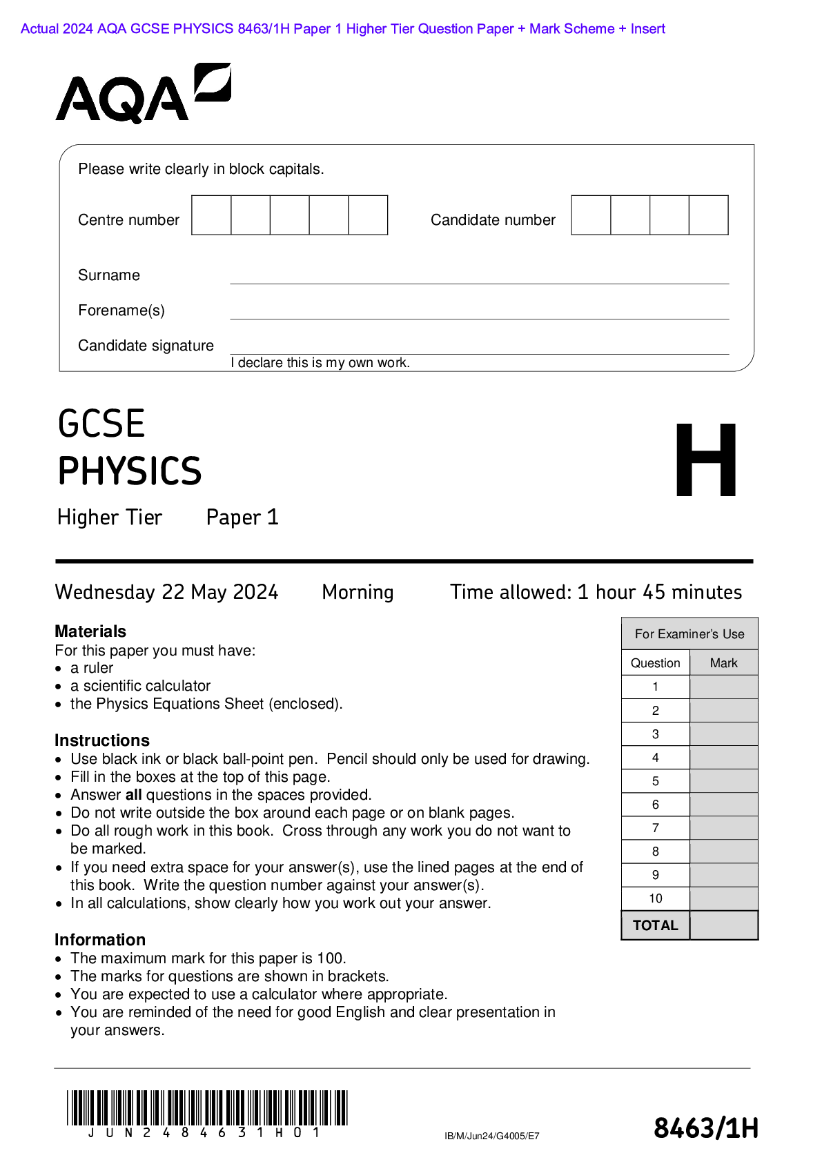 AQA > AQA > Actual 2024 AQA GCSE PHYSICS 8463/1H Paper 1 Higher Tier Question Paper + Mark Scheme + Insert Actual 2024 AQA GCSE PHYSICS 8463/1H Paper 1 Higher Tier Merged Question Paper + Mark Scheme + Insert (All)