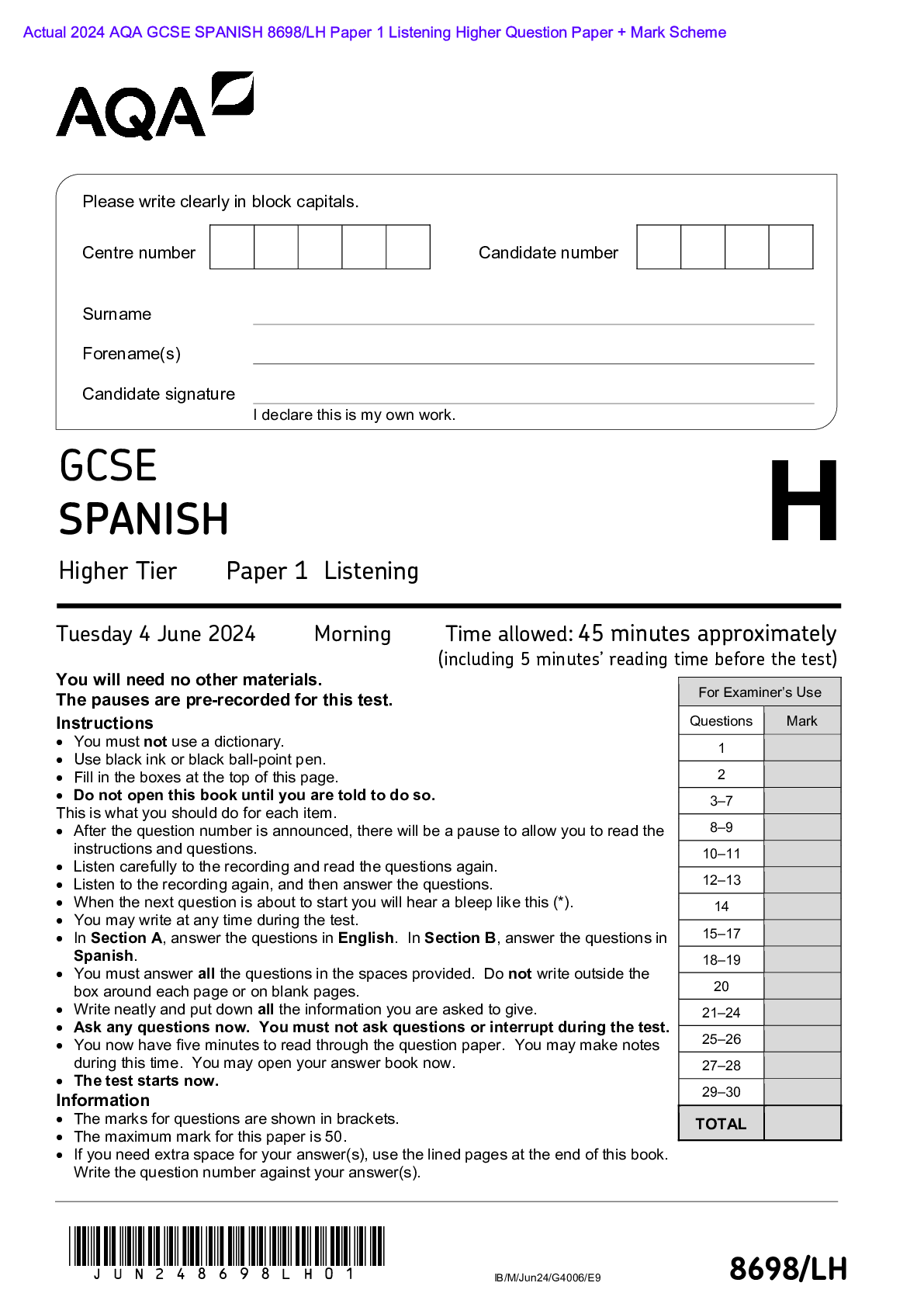 AQA > AQA > Actual 2024 AQA GCSE SPANISH 8698/LH Paper 1 Listening Higher Question Paper + Mark Scheme Actual 2024 AQA GCSE SPANISH 8698/LH Paper 1 Listening Higher Tier Merged Question Paper + Mark Scheme (with Listening Test Transcript) (All)