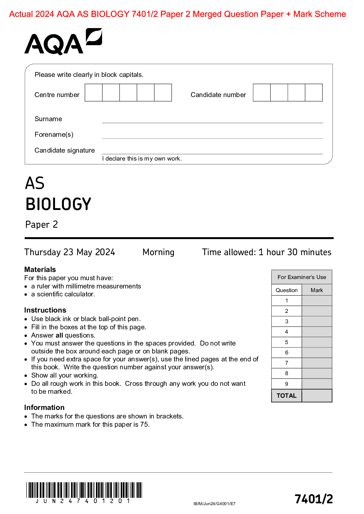 AQA > AQA > Actual 2024 AQA AS BIOLOGY 7401/2 Paper 2 Merged Question Paper + Mark Scheme Actual 2024 AQA AS BIOLOGY 7401/2 Paper 2 Merged Question Paper + Mark Scheme (All)