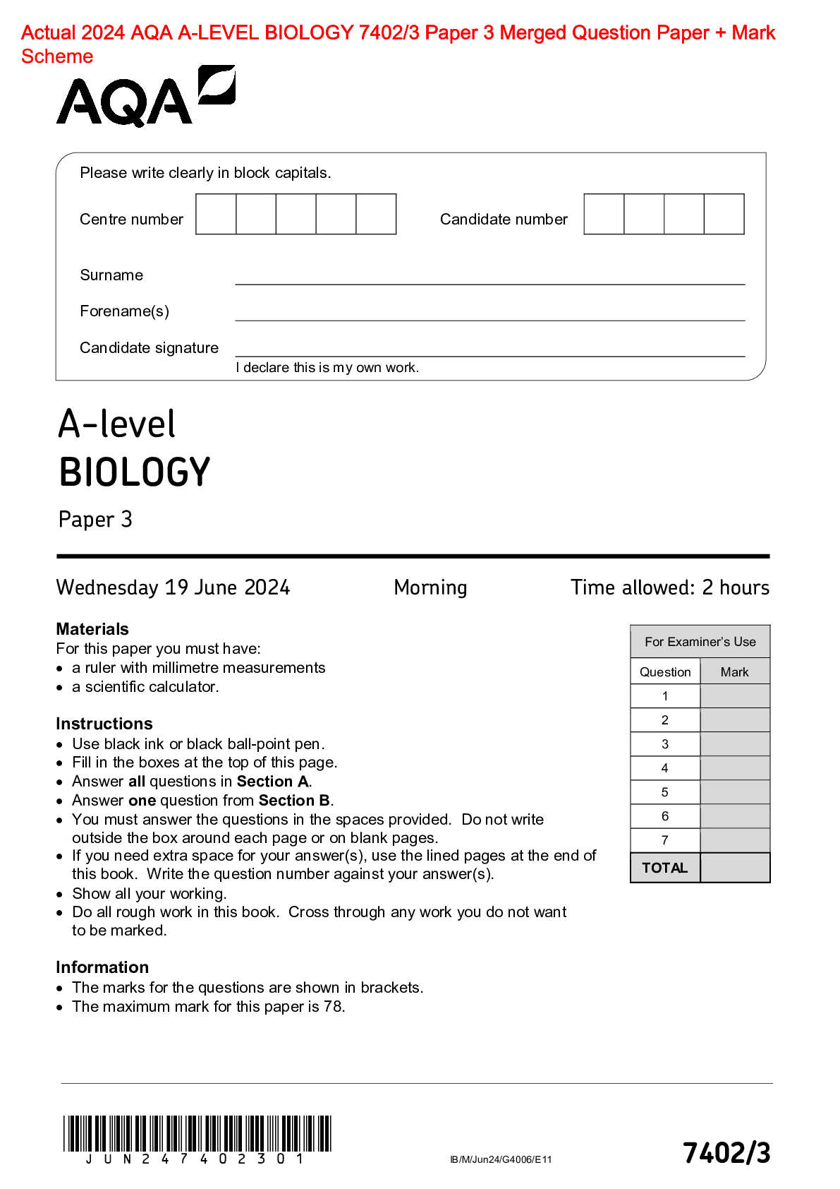 AQA > AQA > Actual 2024 AQA A-LEVEL BIOLOGY 7402/2 Paper 2 Merged Question Paper + Mark Scheme Actual 2024 AQA A-LEVEL BIOLOGY 7402/2 Paper 2 Merged Question Paper + Mark Scheme (All)