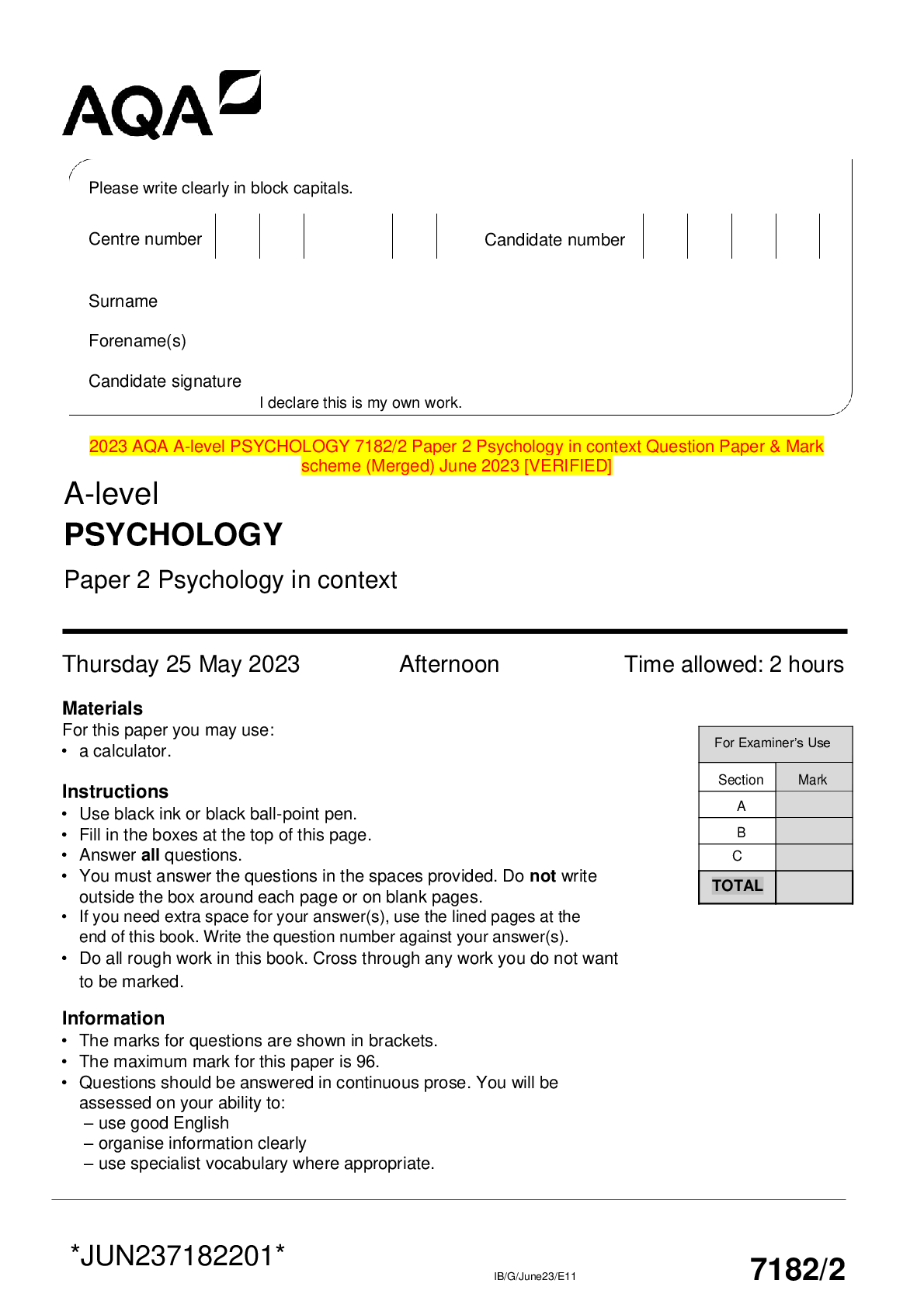 AQA > AQA QUESTION and MARK SCHEMES > 2023 AQA A-level PSYCHOLOGY 7182/2 Paper 2 Psychology in context Question Paper & Mark scheme (Merged) June 2023 [VERIFIED] (All)