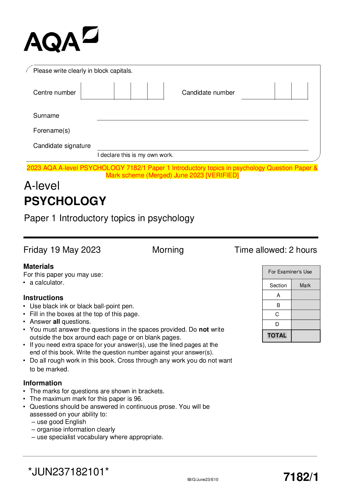 AQA > AQA QUESTION and MARK SCHEMES > 2023 AQA A-level PSYCHOLOGY 7182/1 Paper 1 Introductory topics in psychology Question Paper & Mark scheme (Merged) June 2023 [VERIFIED] (All)