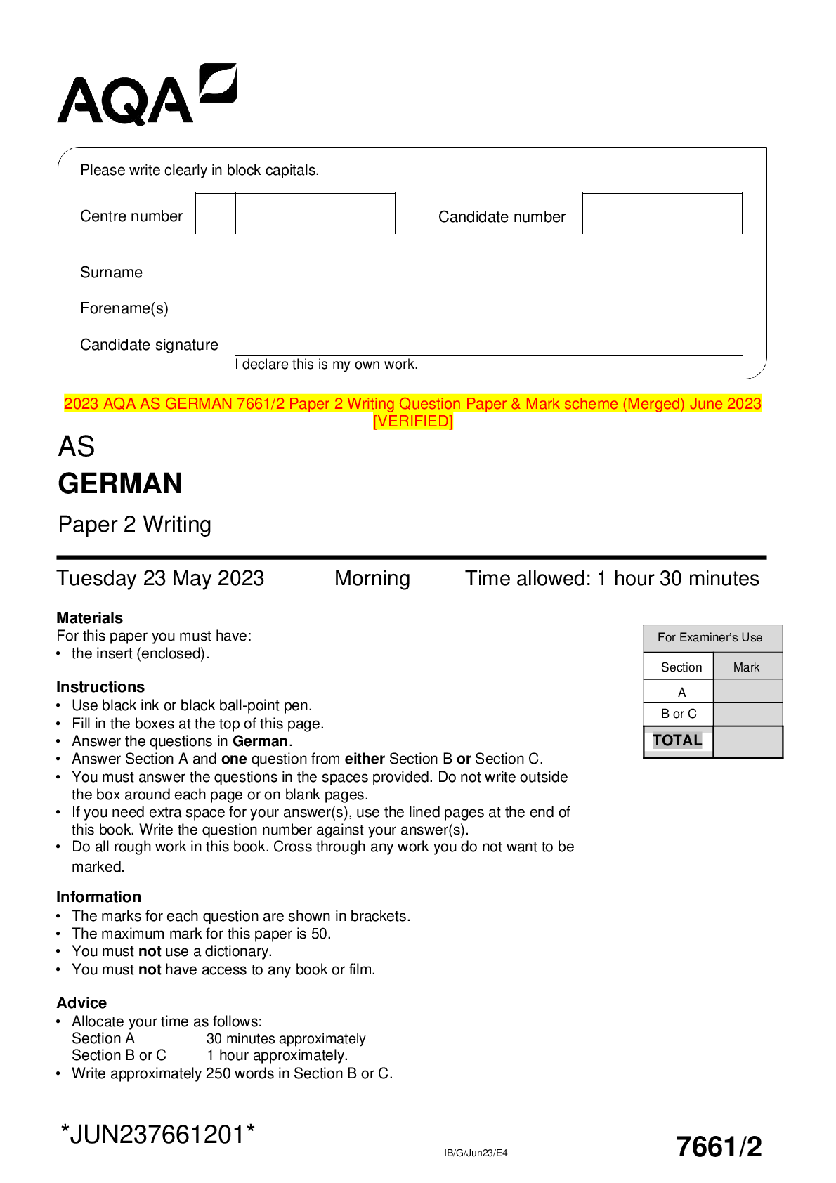 AQA > AQA QUESTION and MARK SCHEMES > 2023 AQA AS GERMAN 7661/2 Paper 2 Writing Question Paper & Mark scheme (Merged) June 2023 [VERIFIED] (All)
