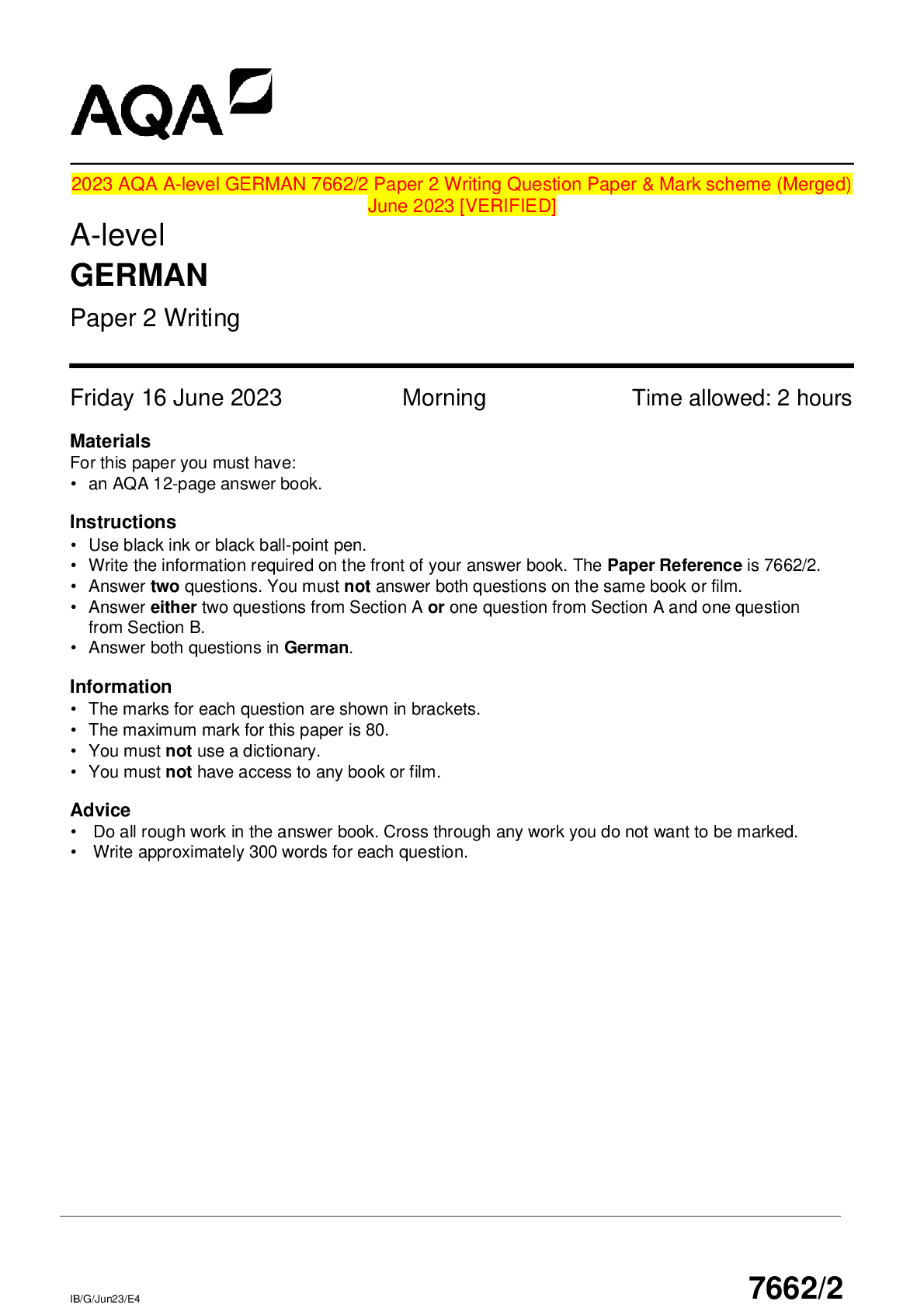 AQA > AQA QUESTION and MARK SCHEMES > 2023 AQA A-level GERMAN 7662/2 Paper 2 Writing Question Paper & Mark scheme (Merged) June 2023 [VERIFIED] (All)