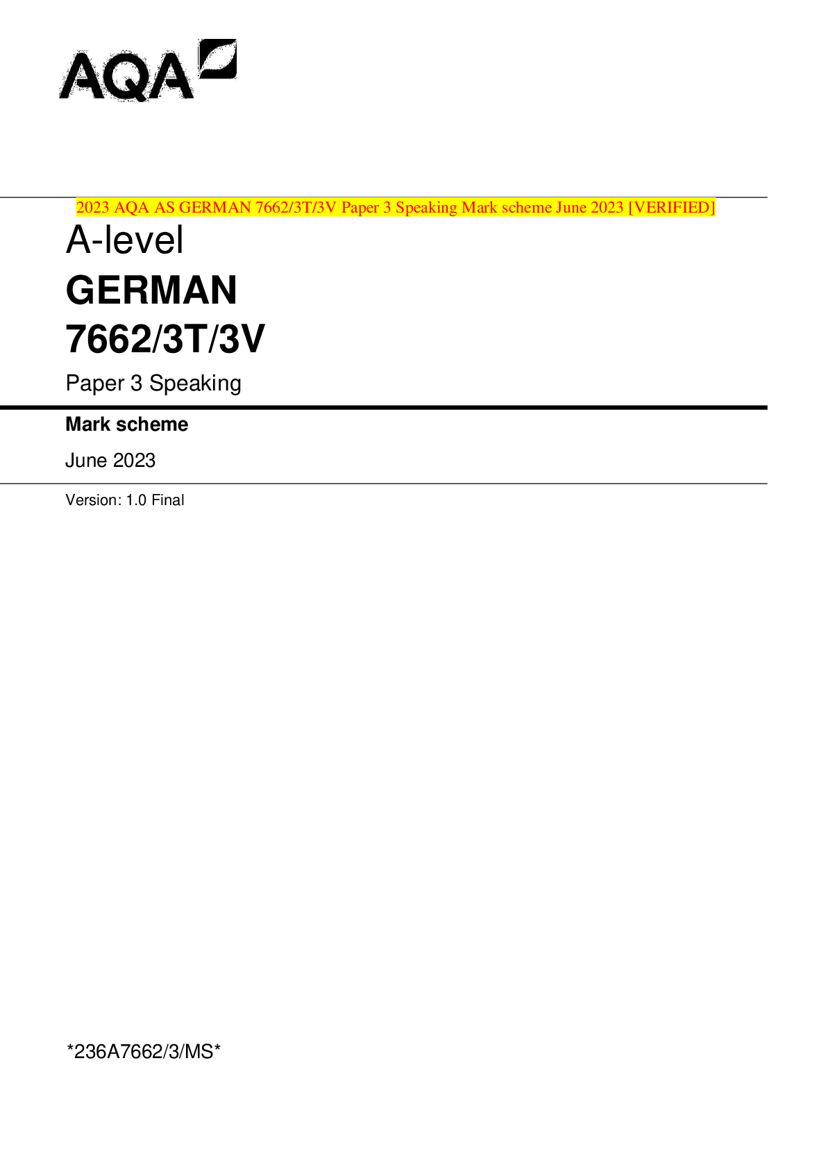 AQA > AQA QUESTION and MARK SCHEMES > 2023 AQA AS GERMAN 7662/3T/3V Paper 3 Speaking Mark scheme June 2023 [VERIFIED] (All)