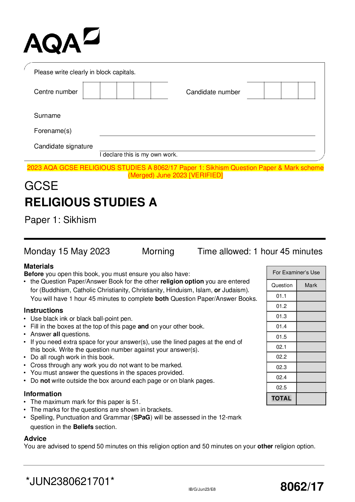 AQA > AQA QUESTION and MARK SCHEMES > 2023 AQA GCSE RELIGIOUS STUDIES A 8062/17 Paper 1: Sikhism Question Paper & Mark scheme (Merged) June 2023 [VERIFIED] (All)