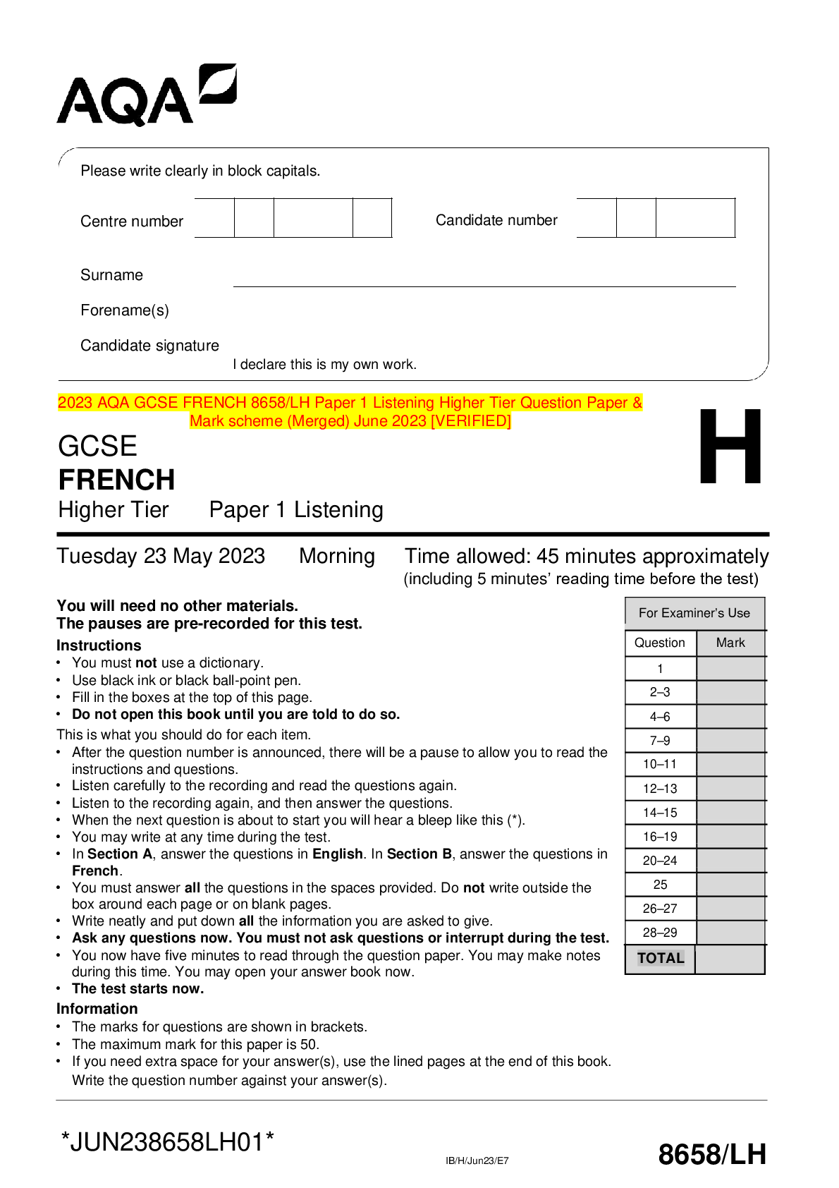 AQA > AQA QUESTION and MARK SCHEMES > 2023 AQA GCSE FRENCH 8658/LH Paper 1 Listening Higher Tier Question Paper & Mark scheme (Merged) June 2023 [VERIFIED] (All)