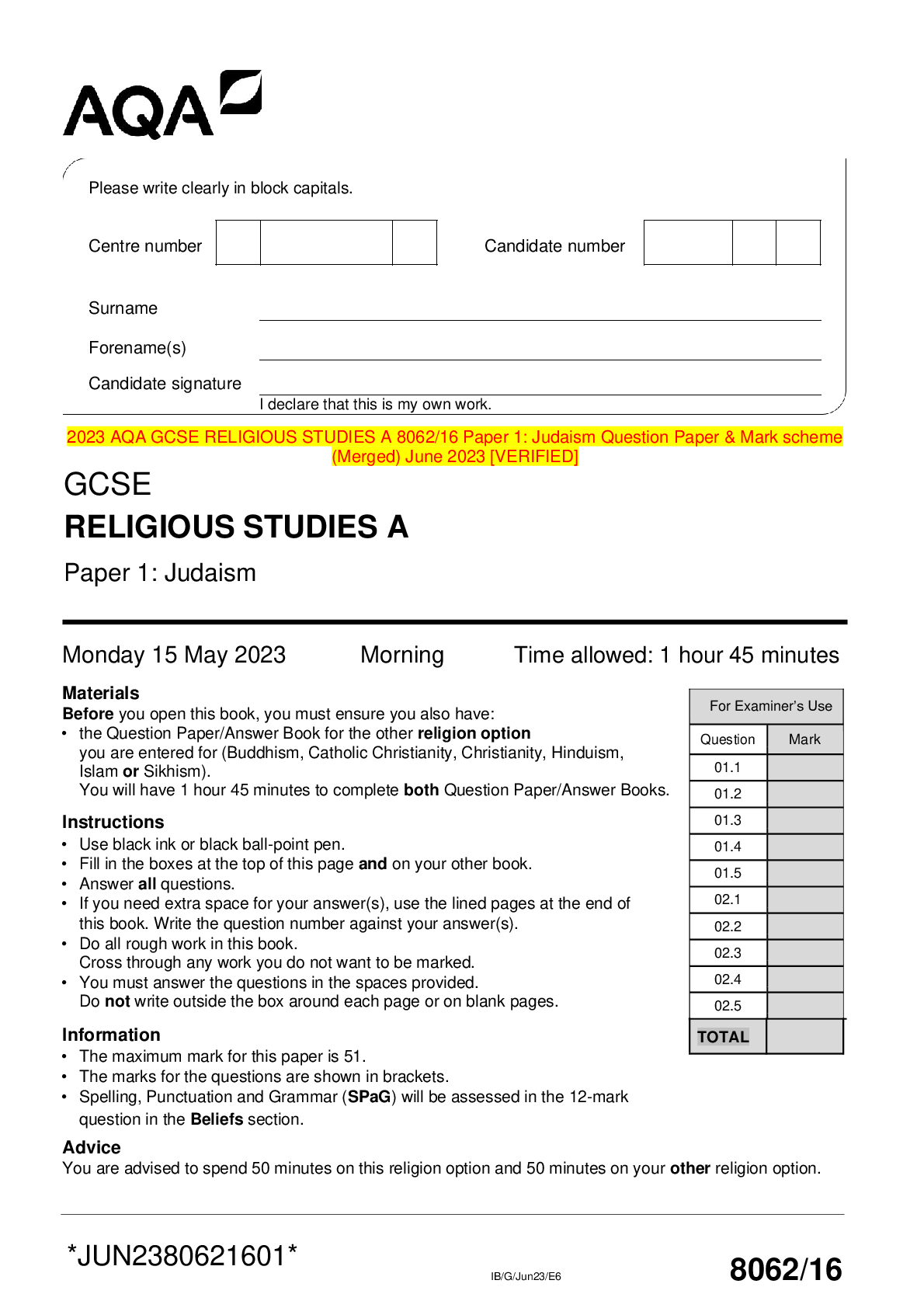 AQA > AQA QUESTION and MARK SCHEMES > 2023 AQA GCSE RELIGIOUS STUDIES A 8062/16 Paper 1: Judaism Question Paper & Mark scheme (Merged) June 2023 [VERIFIED] (All)