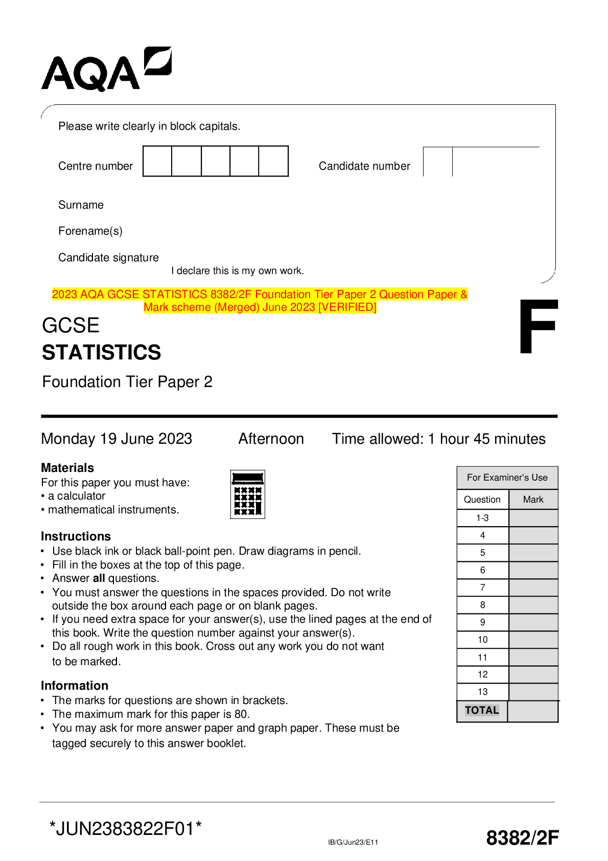 AQA > AQA QUESTION and MARK SCHEMES > 2023 AQA GCSE STATISTICS 8382/2F Foundation Tier Paper 2 Question Paper & Mark scheme (Merged) June 2023 [VERIFIED] (All)