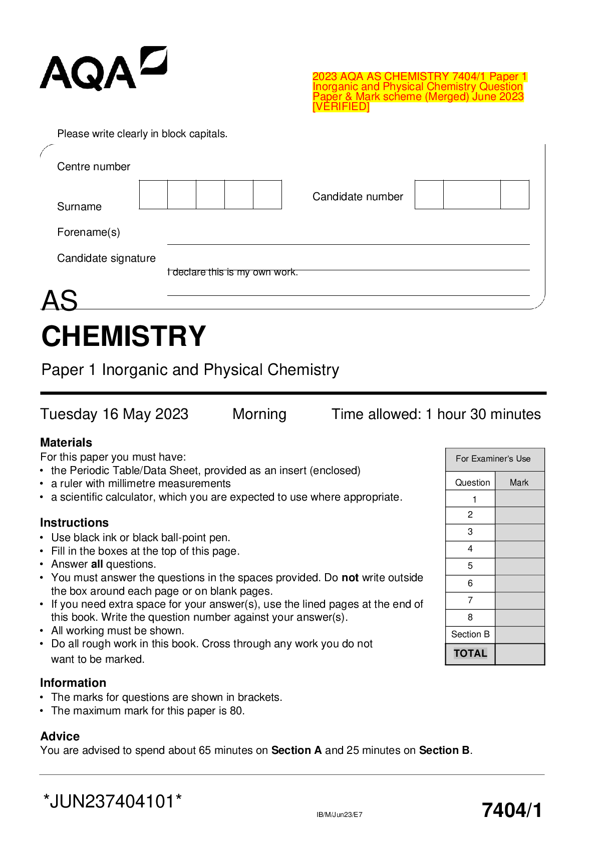 AQA > AQA QUESTION and MARK SCHEMES > 2023 AQA AS CHEMISTRY 7404/1 Paper 1 Inorganic and Physical Chemistry Question Paper & Mark scheme (Merged) June 2023 [VERIFIED] (All)