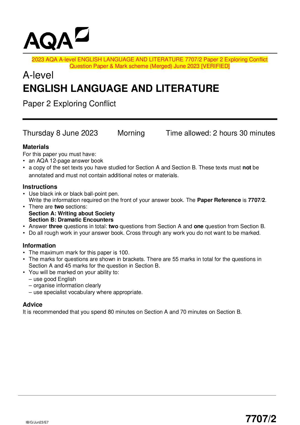 AQA > AQA QUESTION and MARK SCHEMES > 2023 AQA A-level ENGLISH LANGUAGE AND LITERATURE 7707/2 Paper 2 Exploring Conflict Question Paper & Mark scheme (Merged) June 2023 [VERIFIED] (All)