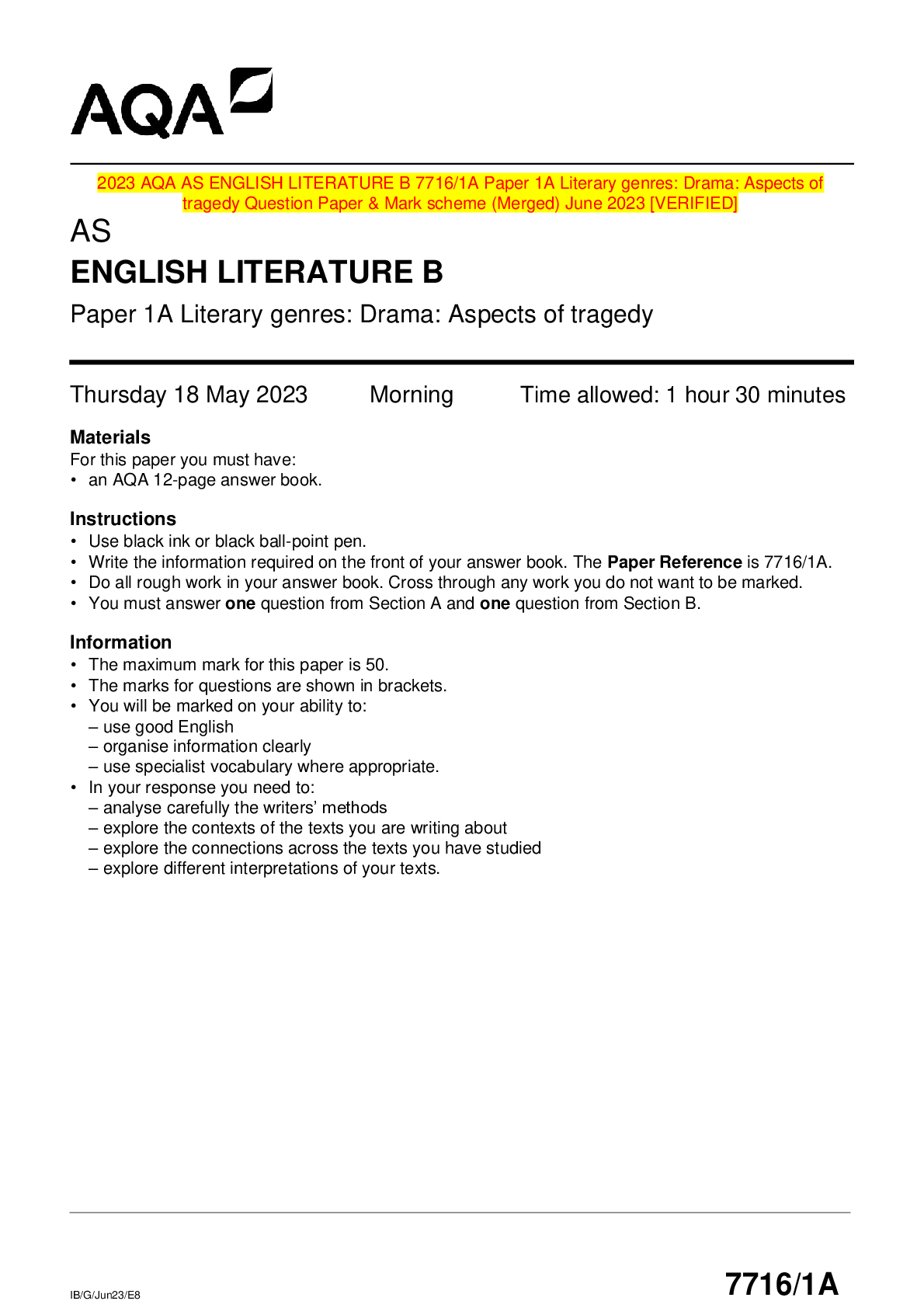 AQA > AQA QUESTION and MARK SCHEMES > 2023 AQA AS ENGLISH LITERATURE B 7716/1A Paper 1A Literary genres: Drama: Aspects of tragedy Question Paper & Mark scheme (Merged) June 2023 [VERIFIED] (All)