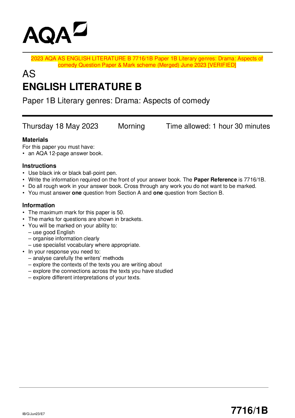AQA > AQA QUESTION and MARK SCHEMES > 2023 AQA AS ENGLISH LITERATURE B 7716/1B Paper 1B Literary genres: Drama: Aspects of comedy Question Paper & Mark scheme (Merged) June 2023 [VERIFIED] (All)